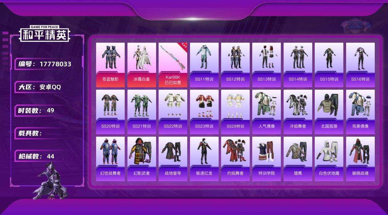 【574146】[17778033]【FK6550】49套装/枪械1/装备41/战备35/热力值15058/一级Kar98K-巳巳如意/苍蓝魅影/冰霜白皇/Kar98K-巳巳如意/炫紫旋律降落伞/机甲封神降落伞/红伞翩翩降落伞/AKM-夜灯/M16A4-幻世战舞者/SCAR-L-粉色回忆/SCAR-L-繁花小夜曲/M416-红色方程式/AUG-焰龙焚天/QBZ-电玩视界/AC-VAL-天降萌叽/