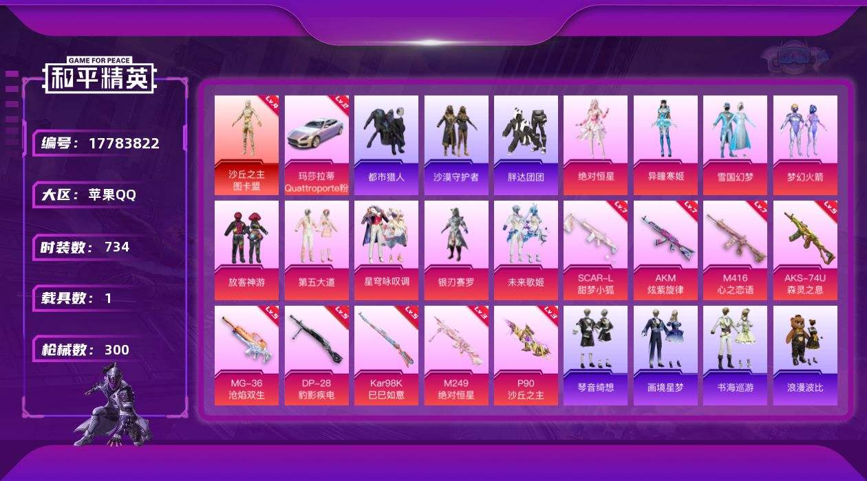 【575162】【不可二次】【苹果QQ】龟仙人 大橘为重 雪国梦幻 漫步者 P90-沙丘之主 都市猎人 M249-古堡领主 SCAR-L-甜梦小狐 沙丘之主-图卡盟 放客神游 银刃赛罗 M416-仓鼠灰灰 M416-心之恋语 浪漫波比 沙漠守护者 浪漫天命 梦幻火箭飞行器 胖达团团 迅捷狂鲨 狂沙舞者 诡面顽熊 玛莎拉蒂幻星粉 AKM-炫紫旋律 雪国幻梦 梦幻火箭 AKM-缤纷海域 AKM-百万