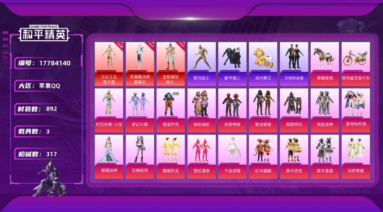【575255】【不可二次】【苹果QQ】龟仙人 水银刺客 漫步者 都市猎人 沙丘之主-图卡盟 星空之魅 红伞翩翩 MK47-林间仙鹿 缤纷油彩 碧影闪光 M416-超新星 镜光幻境飞行翼 纯白誓言 SCAR-L-梦幻火箭 怪诞乔克 迅捷狂鲨 M762-瑞龙福将 齐天大圣飞行器 龙翔九天飞行器 AKM-炫紫旋律 黄伞悠悠 甜蜜誓约 木乃伊 平底锅-林间仙鹿 M416-五爪金龙 P90-沙丘之主 金