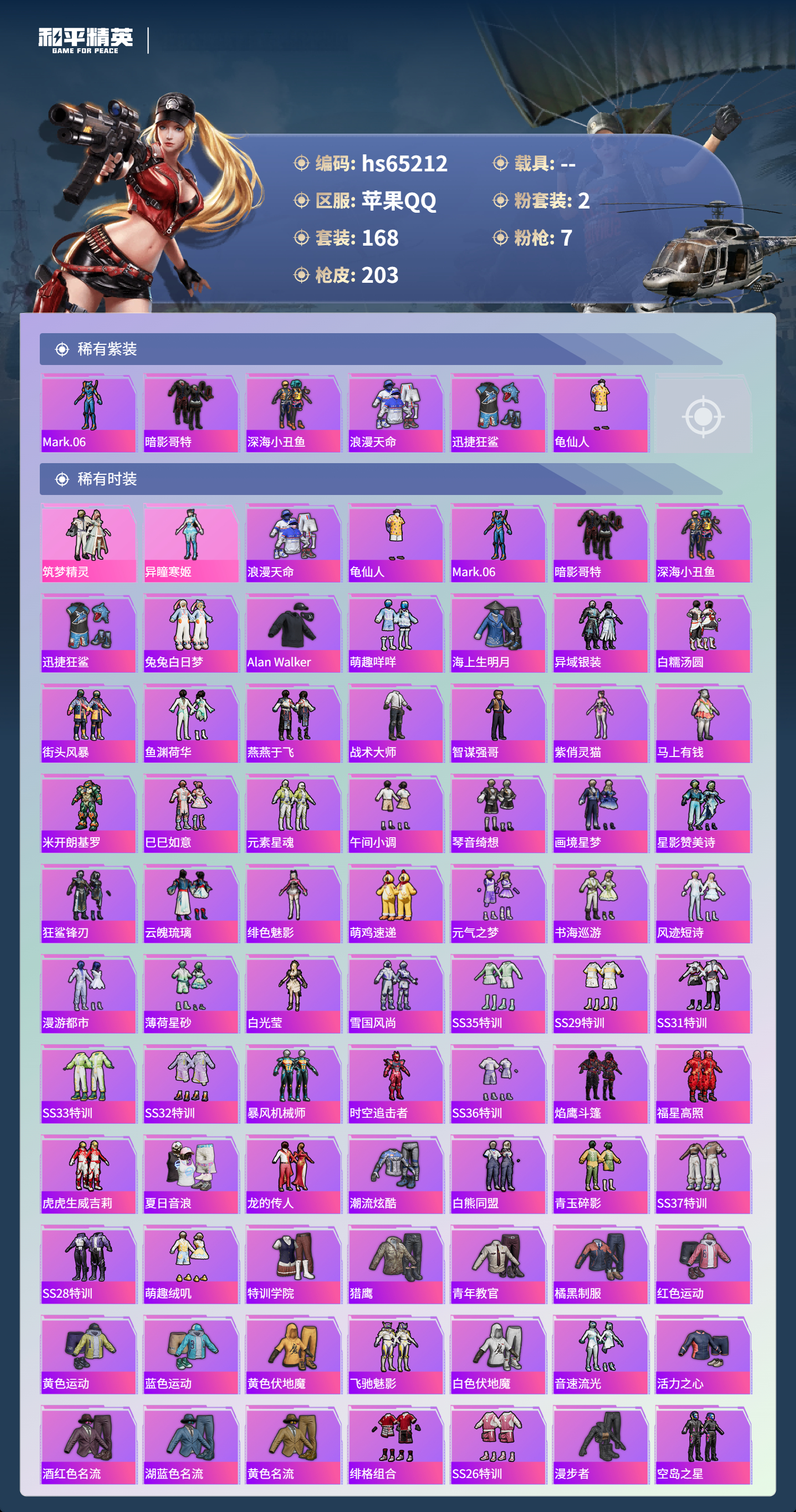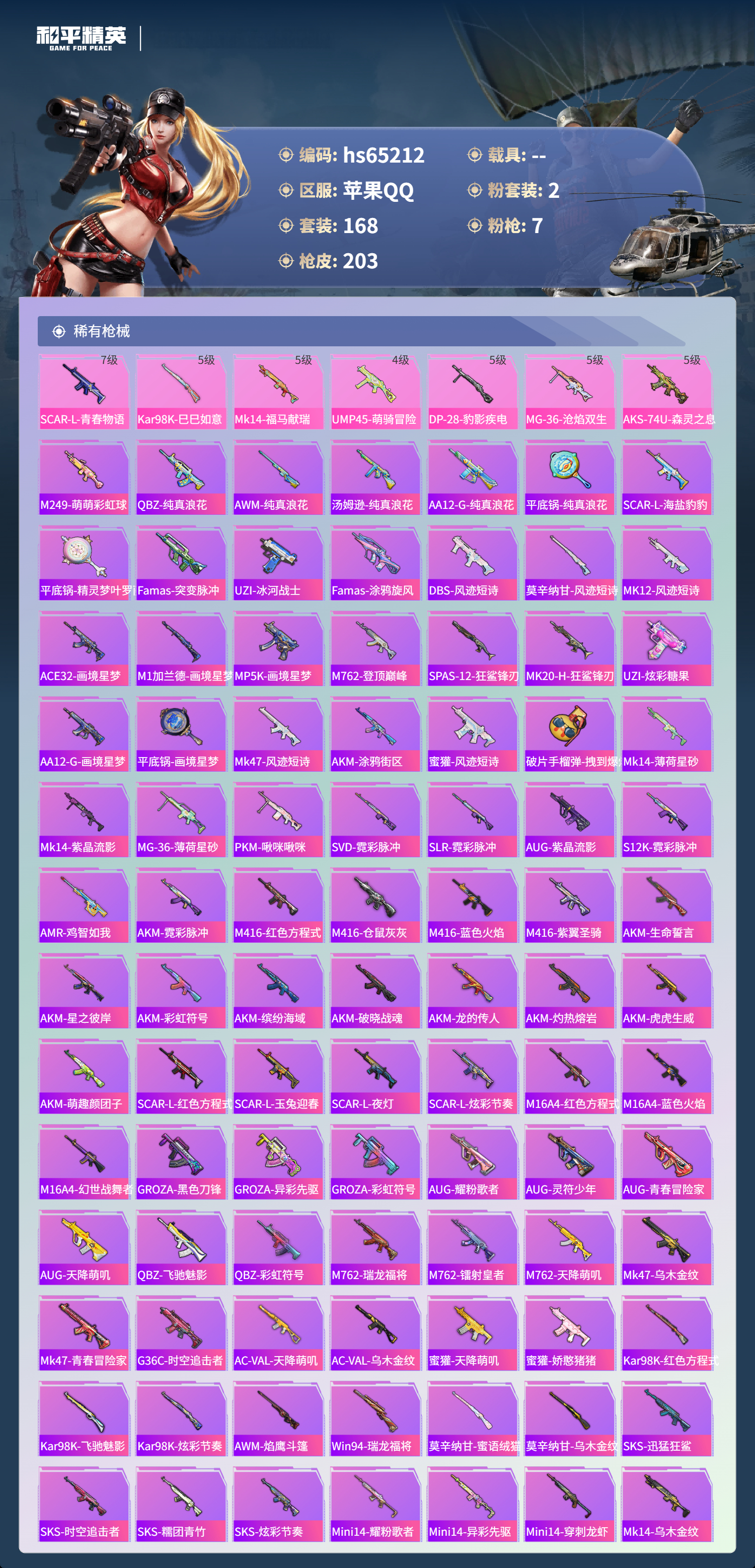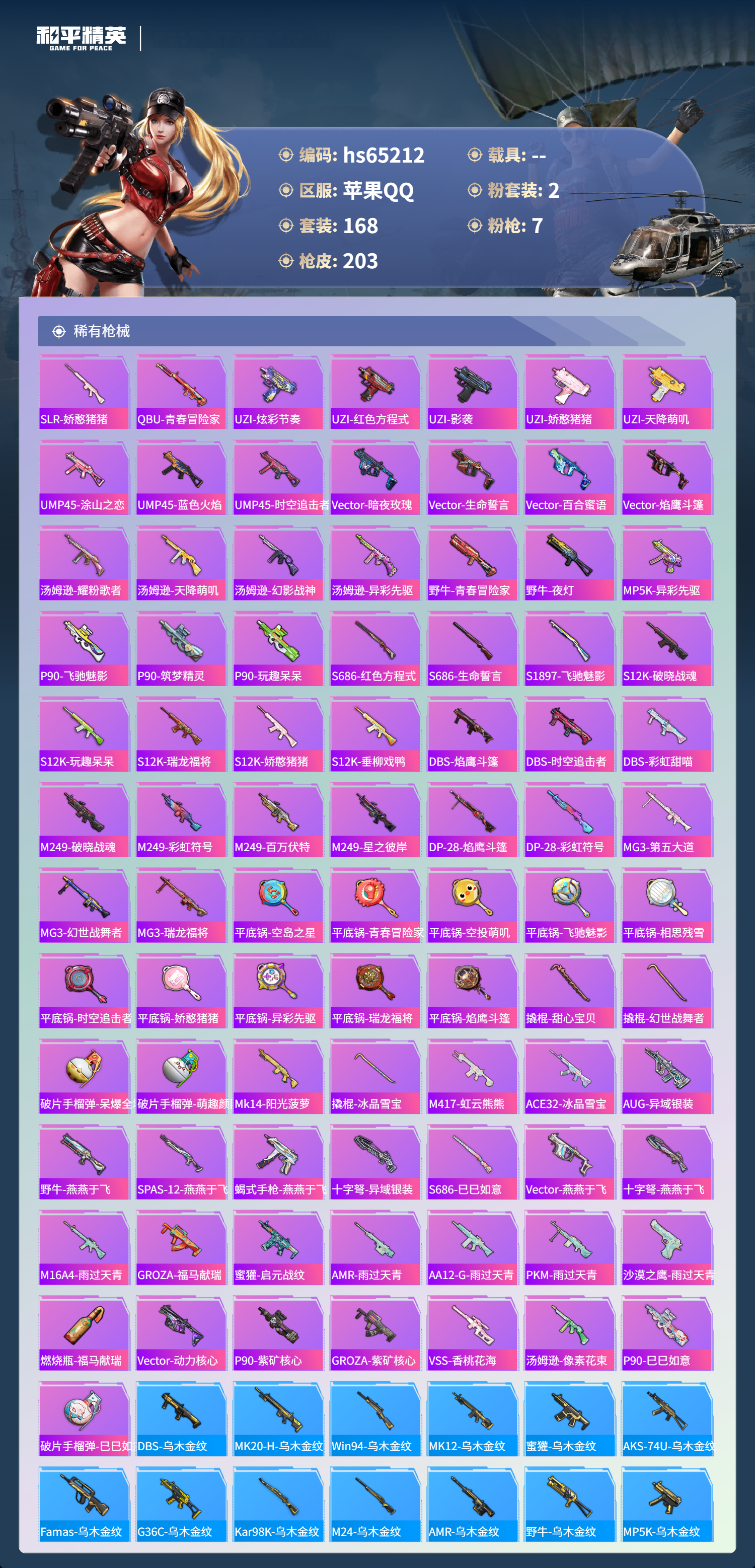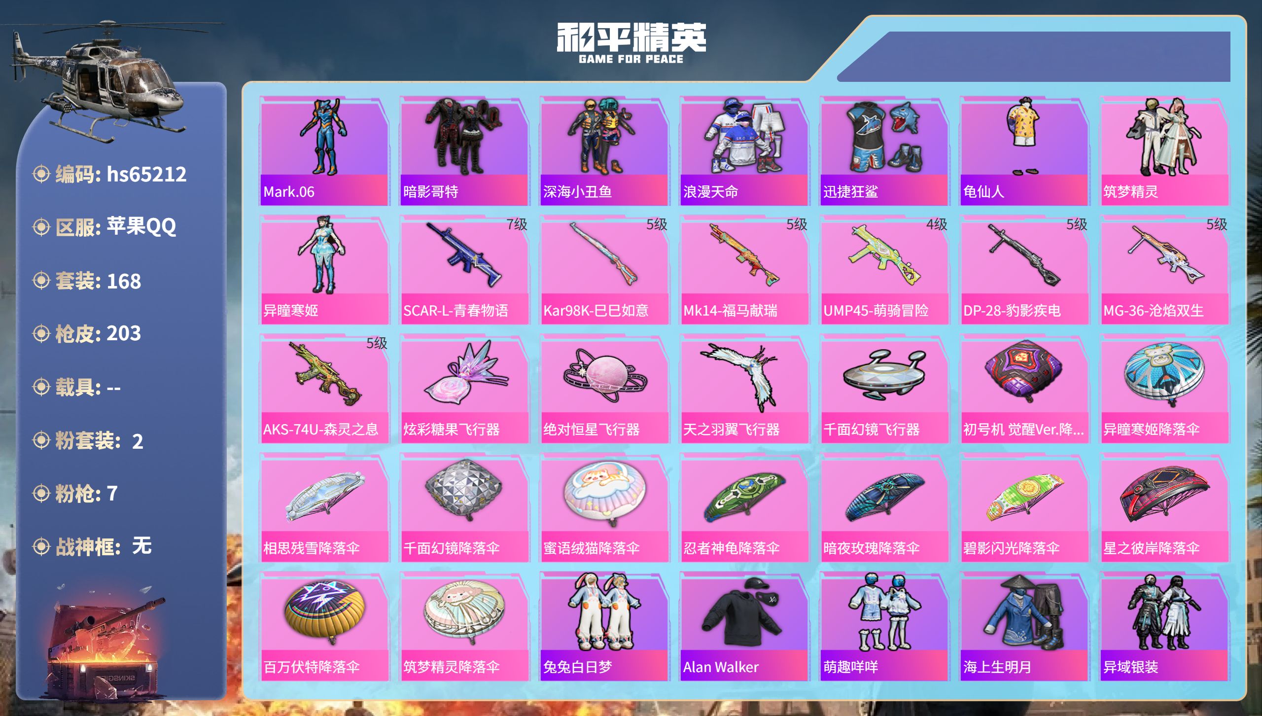 【576008】【不可二次】【苹果QQ】龟仙人 漫步者 迅捷狂鲨 M762-瑞龙福将 千面幻镜飞行器 极速红龙 M416-仓鼠灰灰 AKM-缤纷海域 粉红小猪 深海小丑鱼 天之羽翼飞行器 瑞龙福将 浪漫天命 SCAR-L-青春物语 暗影哥特 团圆交子