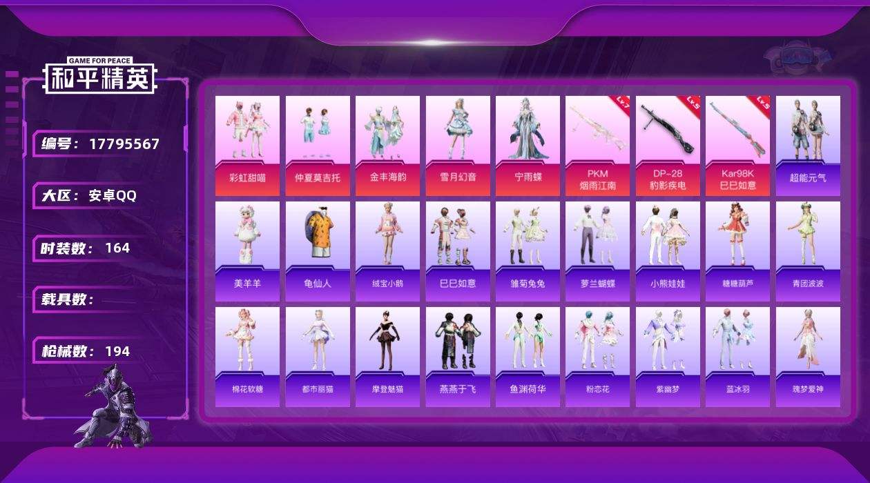 【576882】[17795567]【kyhp493】安卓 手Q-6粉装-4特效枪-0载具-5粉色飞行器-59287热力值-12王牌印记-164套装-194枪皮【热门品类】:套装-龟仙人【粉色套装】:粉装-彩虹甜喵,粉装-仲夏莫吉托,粉装-金丰海韵,粉装-雪月幻音,角色-宁雨蝶【粉色枪皮等级】:Kar98K-巳巳如意(五级),DP-28-豹影疾电(五级),PKM-江南烟雨(七级)【粉色枪皮】:K