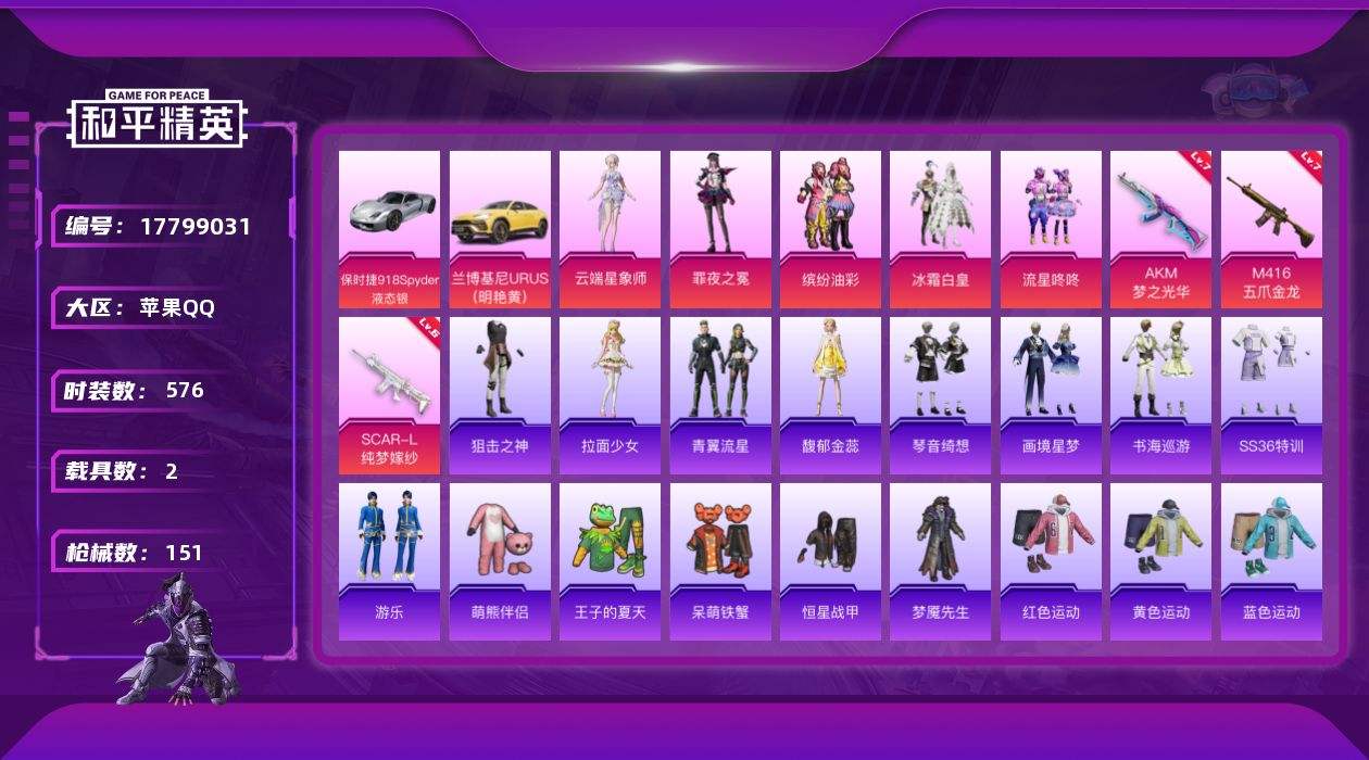 【577302】【可二次】【苹果QQ】M416-五爪金龙 暗夜契约 蝎王蛇后 流星咚咚 兰博SUV黄色 摩登艾咪 AKM-梦之光华 诡谋托雷基亚 童话森林 缤纷油彩 粉红小猪 瑞龙福将 浪漫天命 闪金天王 梦之呓语 冰霜白皇 雪山精英 团圆交子