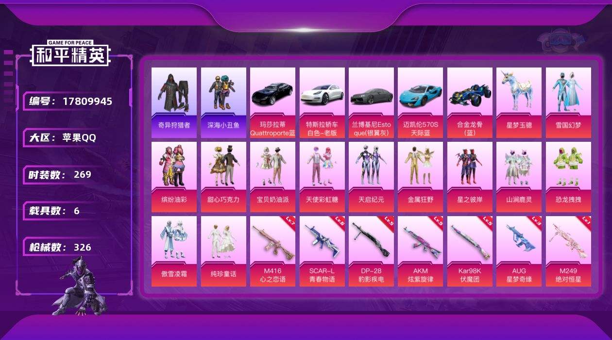 【578404】【不可二次】【苹果QQ】合金龙骨蓝色 恐龙拽拽 大橘为重 雪国梦幻 萌兔起飞 奇异狩猎者 特斯拉3银色 甜心巧克力 金属狂野 天启纪元 兰博轿车灰色 迈凯伦570S 天际蓝 AKM-炫紫旋律 M416-心之恋语 天使彩虹糖 缤纷油彩 深海小丑鱼 浪漫波比 山涧鹿灵 宝贝奶油派 激萌小黄鸭 SCAR-L-青春物语 98K-伏魔团