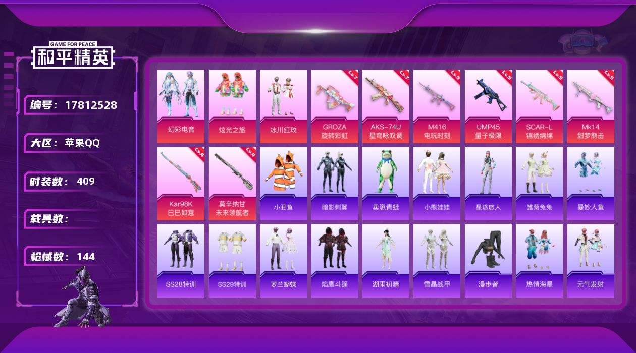 【578710】【不可二次】【苹果QQ】合金龙骨蓝色 M416-五爪金龙 漫步者 都市猎人 洛天依 翡翠骑士 星之彼岸 缤纷油彩 M24-香水柠檬 瑞龙福将 特斯拉R水滴蓝 浪漫天命 团圆交子 绚金战神 M762-激战未来 M762-瑞龙福将 MG3-洛神天依 狂沙舞者 诡面顽熊 AKM-炫紫旋律 梦幻火箭 鬼马风驰 AKM-百万伏特 天使彩虹糖 星夜魔法师飞行翼 SCAR-L-青春物语 冰霜白皇