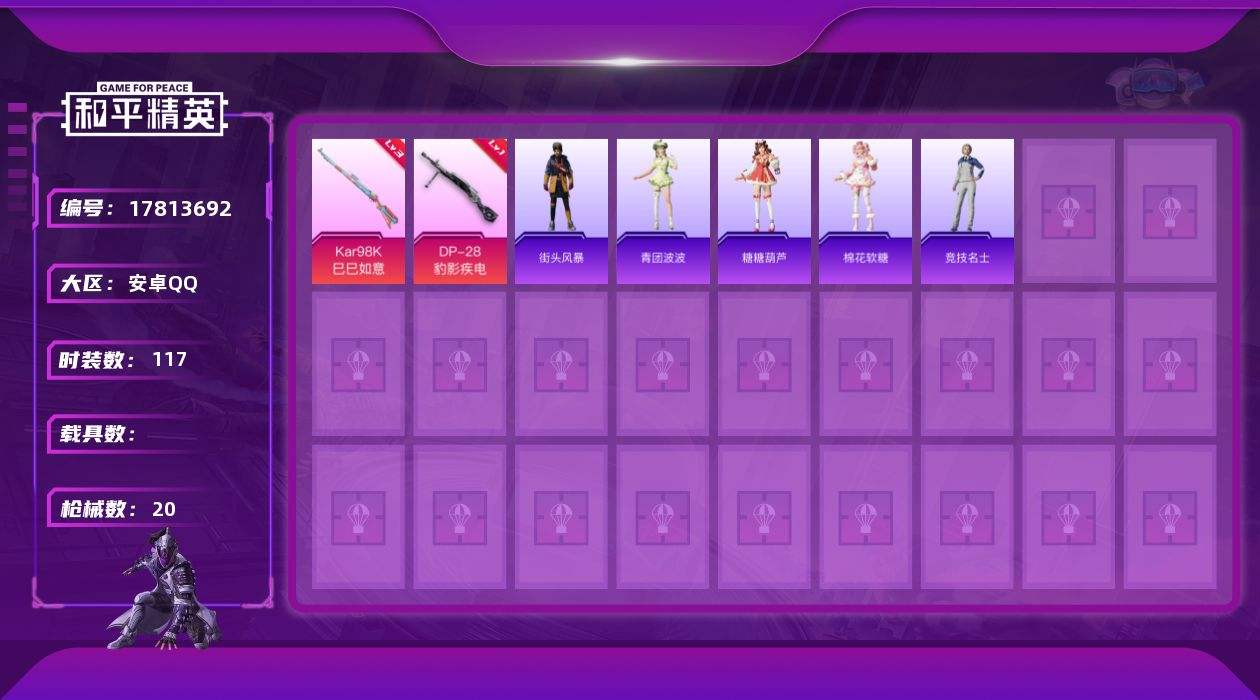 【579173】[17813692]【特价出售】安卓Q-3特效枪26套装20枪皮 6701热力值 1印记 历史卓越王牌11星 【3特效枪】 Kar98K-巳巳如意 (3级) DP-28-豹影疾电 (1级) UMP45-萌骑冒险 (5级) 【1背包】 幻影战神背包