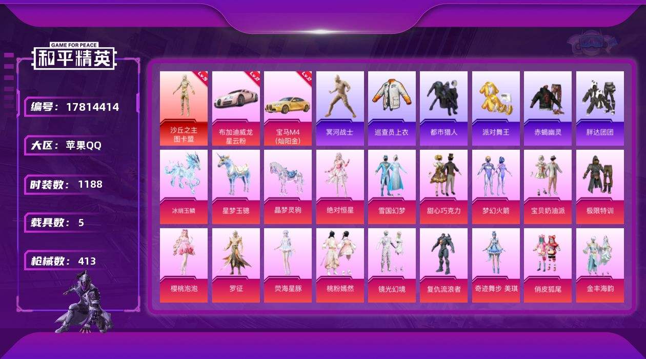 【579358】【可二次】【苹果QQ】龟仙人 水银刺客 漫步者 都市猎人 M249-古堡领主 韶华初心 豚鼠丹丹 忍者信条 沙丘之主-图卡盟 AUG-星梦奇缘 M416-心之恋语 布加迪威龙(星云粉) 醒狮腾龙 AWM-黄金龙骨 纯白誓言 SCAR-L-梦幻火箭 SS1特训 M762-瑞龙福将 齐天大圣飞行器 潮萌小黄鸭 黑色刀锋 新侠客行 龙翔九天飞行器 金羽特工 白月香洋装 AKM-梦之光华