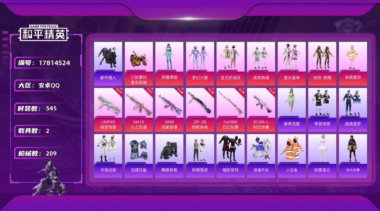 【579379】【不可二次】【安卓QQ】软萌银虎 SCAR-L-时空协奏 S686-奇异狩猎者 漫步者 岚岚物语 都市猎人 迅捷狂鲨 M762-瑞龙福将 齐天大圣飞行器 豚鼠丹丹 AKM-炫紫旋律 梦幻火箭 鬼马风驰 M416-心之恋语 UMP45-相思残雪 宝贝奶油派 星夜魔法师飞行翼 浪漫天命 暗影哥特 团圆交子