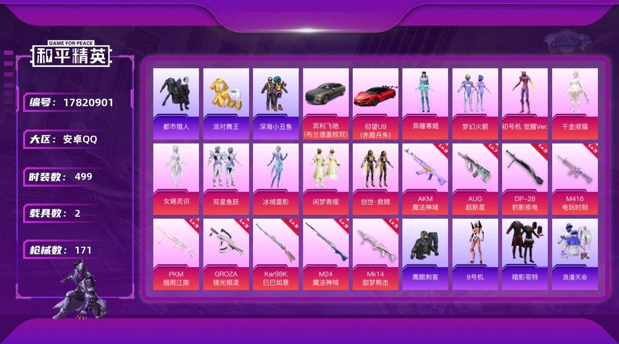 【580348】【可二次】【安卓QQ】龟仙人 漫步者 繁龙极客飞行器 都市猎人 齐天大圣飞行器 AUG-超新星 PKM-江南烟雨 千面幻镜飞行器 M24-魔法神域 狂沙舞者 西部牛仔 仰望U9(赤霞丹朱) AKM-魔法神域 M762-奇异狩猎者 M416-电玩时刻 梦幻火箭 深海小丑鱼 天之羽翼飞行器 派对舞王 绝色倾城飞行器 浪漫天命 暗影哥特