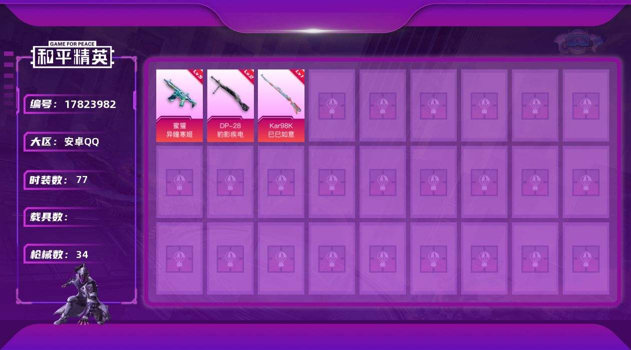 【580818】[17823982]【特价出售】安卓Q-4特效枪13套装34枪皮 8774热力值 历史不屈白银Ⅰ 【4特效枪】 Kar98K-巳巳如意 (1级) DP-28-豹影疾电 (1级) 蜜獾-异瞳寒姬 (5级) Mk14-福马献瑞 (5级)