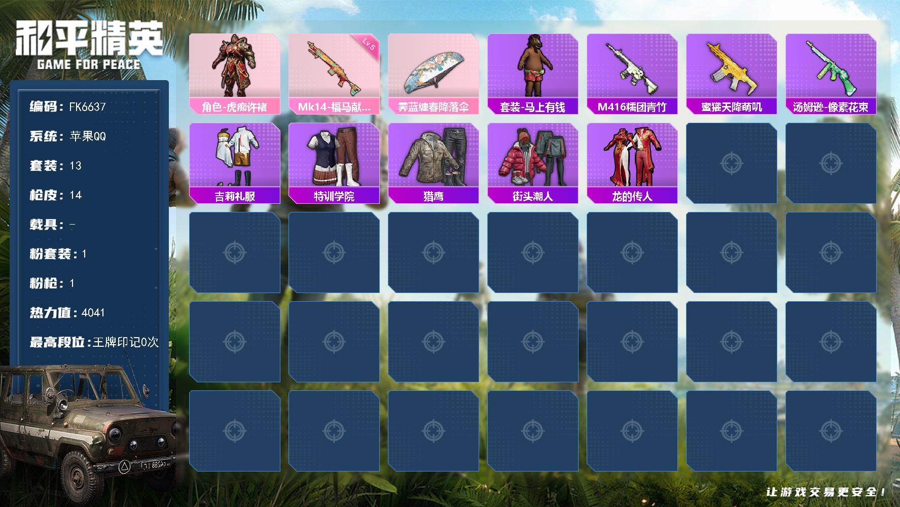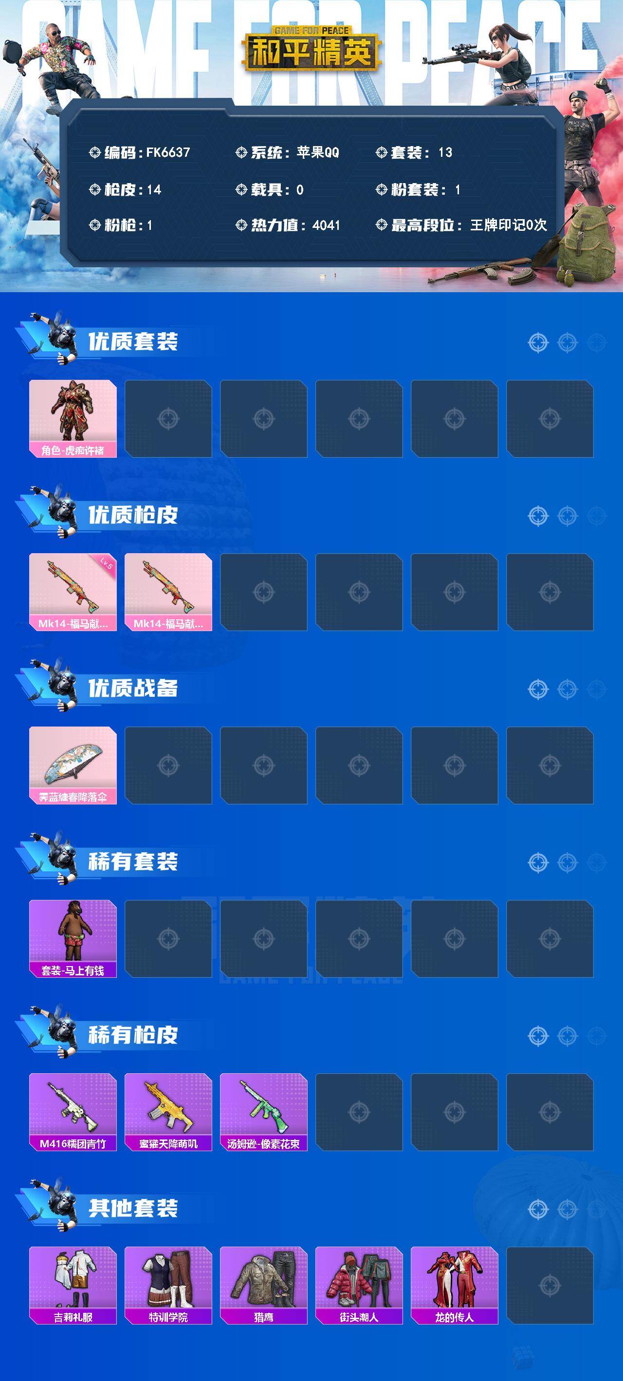【582130】[17834006]【FK6637】13套装/枪械1/装备15/战备19/热力值4041/五级Mk14-福马献瑞/角色-虎痴许褚/Mk14-福马献瑞/霁蓝缠春降落伞/套装-马上有钱/M416-糯团青竹/蜜獾-天降萌叽/汤姆逊-像素花束/吉莉礼服/特训学院/猎鹰/街头潮人/龙的传人