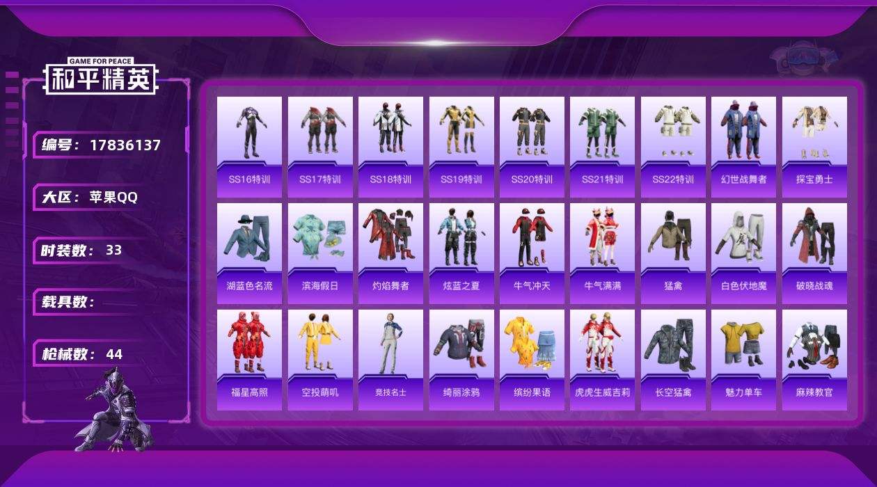 【582367】[17836137]【FK6636】33套装/装备26/战备41/王牌印记4/热力值11223/环太平洋降落伞/垂柳戏鸭降落伞/AKM-灼热熔岩/AKM-生命誓言/AKM-虎虎生威/M16A4-幻世战舞者/SCAR-L-炫彩节奏/SCAR-L-玉兔迎春/SCAR-L-红色方程式/M416-绯红前夜/M416-蓝色火焰/AUG-耀粉歌者/QBZ-彩虹符号/AC-VAL-天降萌叽/蜜