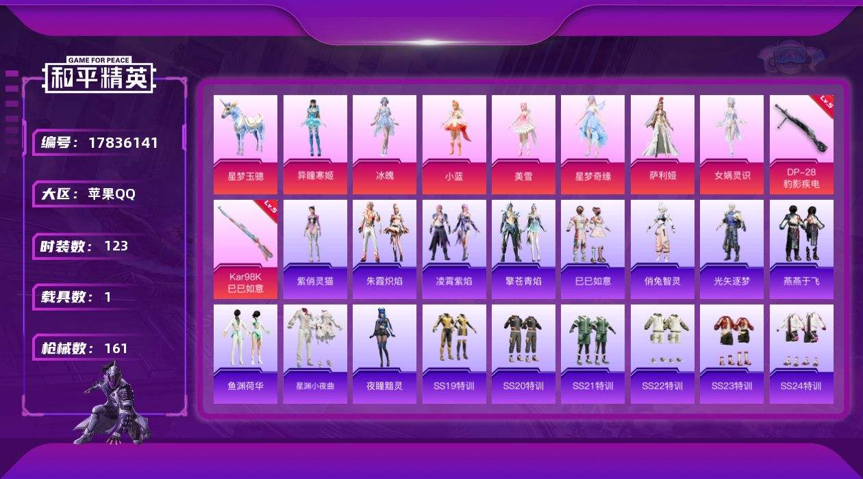 【582370】[17836141]苹果 手Q-7粉装-3特效枪-1载具-3粉色飞行器-45148热力值-6王牌印记-123套装-161枪皮【粉色套装】:角色-小蓝,角色-美雪,角色-星梦奇缘,角色-萨利娅,角色-女娲灵识,角色-冰魄,角色-异瞳寒姬【粉色枪皮等级】:Kar98K-巳巳如意(五级),DP-28-豹影疾电(五级),PKM-萌骑夺宝(四级)【粉色载具】:星梦玉骢【粉色枪皮】:Kar9