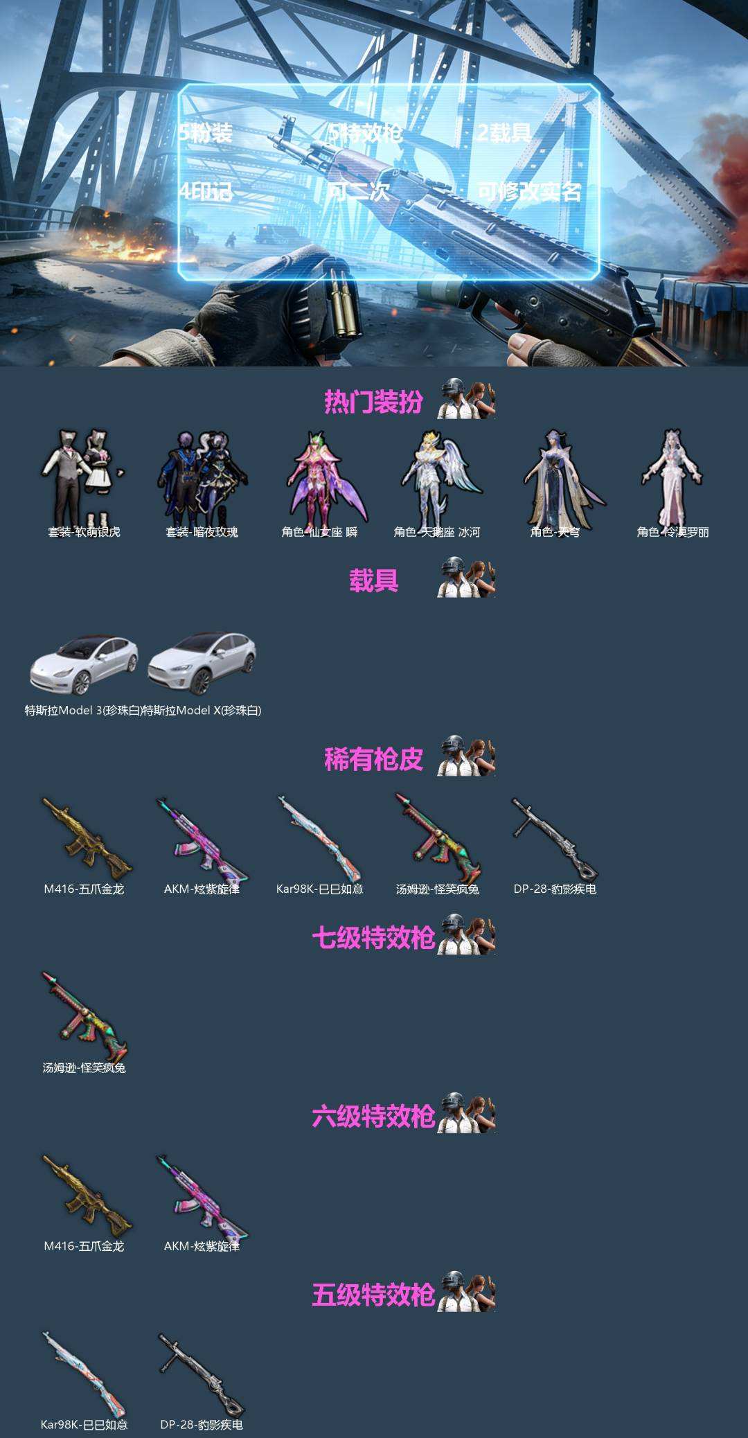 【583076】【可二次】【苹果QQ】M416-五爪金龙 特斯拉3银色 特斯拉X白色 AKM-炫紫旋律 白月香洋装 暗夜玫瑰 汤姆逊-怪笑疯兔 瑞龙福将 风华少年志 闪金天王 雪山精英 迅捷之星 团圆交子