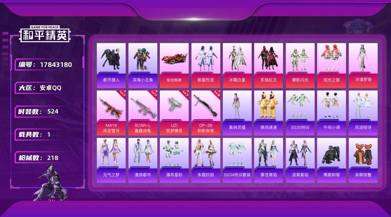 【583151】【可二次】【安卓QQ】龟仙人 焰龙咆哮 漫步者 新星烈龙 炙焰红王 极速红龙 豚鼠丹丹 M416-风花雪月 诡谋托雷基亚 深海小丑鱼 碧影闪光 SCAR-童趣迷兔 瑞龙福将 醒狮腾龙 冰霜白皇 猪猪侠 团圆交子