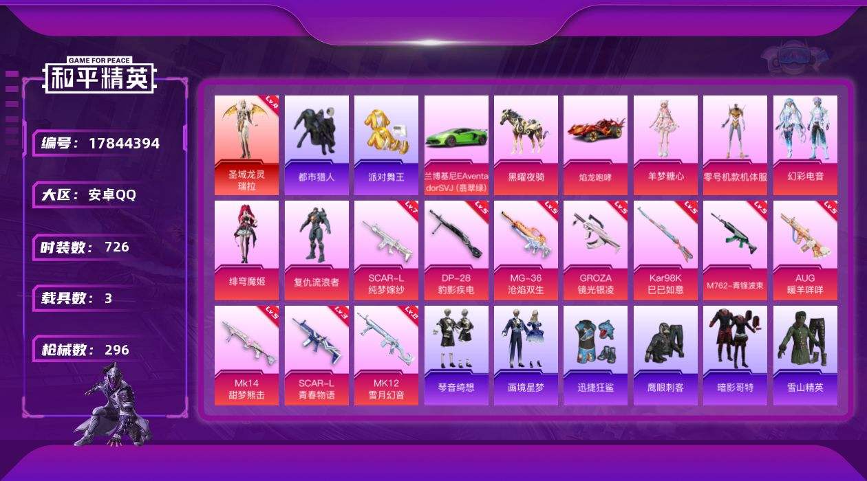 【583305】【不可二次】【安卓QQ】龟仙人 兰博SVJ绿色 红熊茄茄 焰龙咆哮 S686-奇异狩猎者 M762-青锋波束 漫步者 都市猎人 迅捷狂鲨 狂沙舞者 极速红龙 AKM-百万伏特 圣域龙灵-瑞拉 黄螳螂 SCAR-L-纯梦嫁纱 派对舞王 SCAR-L-青春物语 暗影哥特 雪山精英 AWM-黄金龙骨