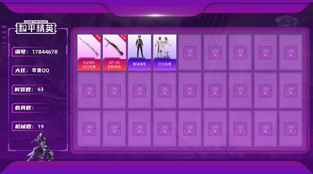 【583422】[17844678]【特价出售】苹果Q-1粉装4特效枪1热门13套装19枪皮 5045热力值 历史坚韧铂金Ⅰ 【1粉装】 虎痴许褚 【4特效枪】 Kar98K-巳巳如意 (5级) DP-28-豹影疾电 (3级) Mk14-福马献瑞 (4级) PKM-萌骑夺宝 (3级) 【1热门】 军刀雅典娜