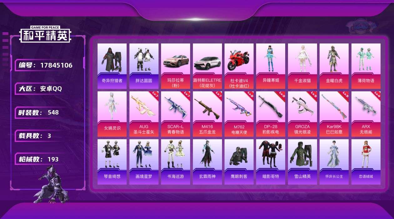 【583610】【可二次】【安卓QQ】龟仙人 S686-奇异狩猎者 M762-电糖天使 M416-五爪金龙 金曜白虎 繁龙极客飞行器 奇异狩猎者 极速红龙 M762-奇异狩猎者 路特斯EL灰色 AKM-缤纷海域 浪漫假日 粉红小猪 金耀白虎 玛莎拉蒂粉色 薄荷物语 SCAR-L-青春物语 暗影哥特 雪山精英 胖达圆圆