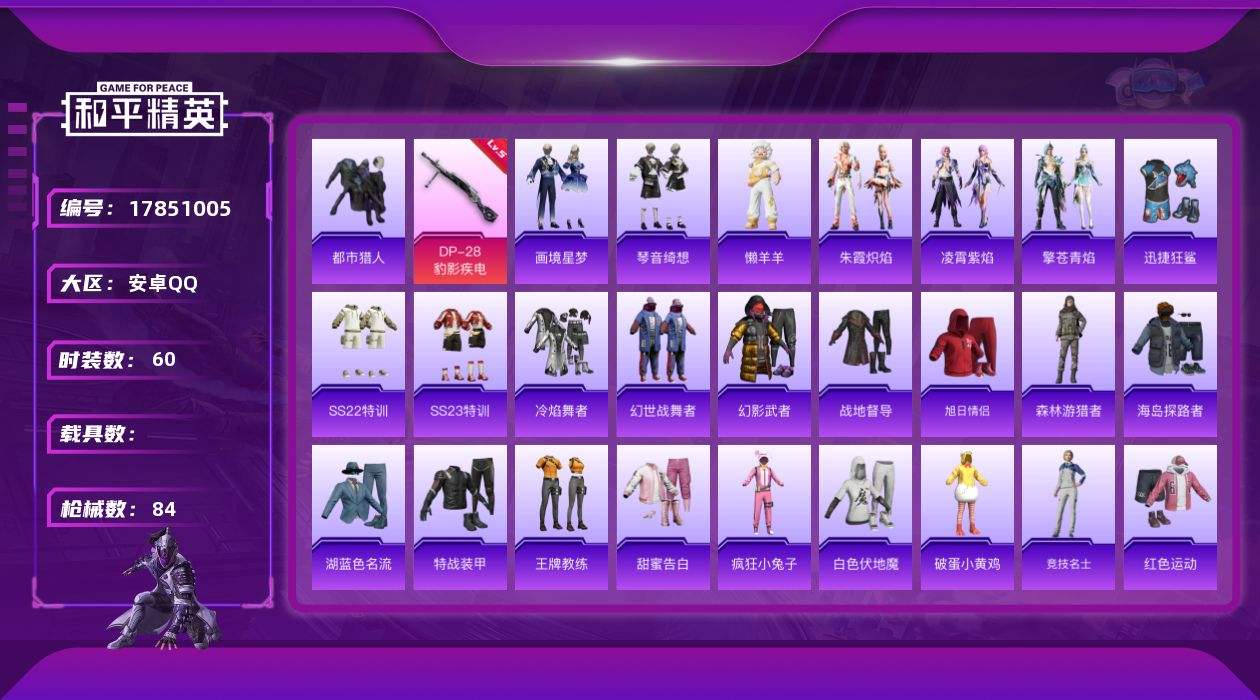 【584814】[17851005]【FK6481】60套装/枪械5/装备76/战备50/王牌印记1/热力值21835/五级ACE32-萌骑漫游/五级AKS-74U-森灵之息/五级Mk14-福马献瑞/二级AA12-G-萌骑幻想/五级DP-28-豹影疾电/都市猎人/ACE32-萌骑漫游/AKS-74U-森灵之息/Mk14-福马献瑞/AA12-G-萌骑幻想/DP-28-豹影疾电/炫彩糖果飞行器/星穹