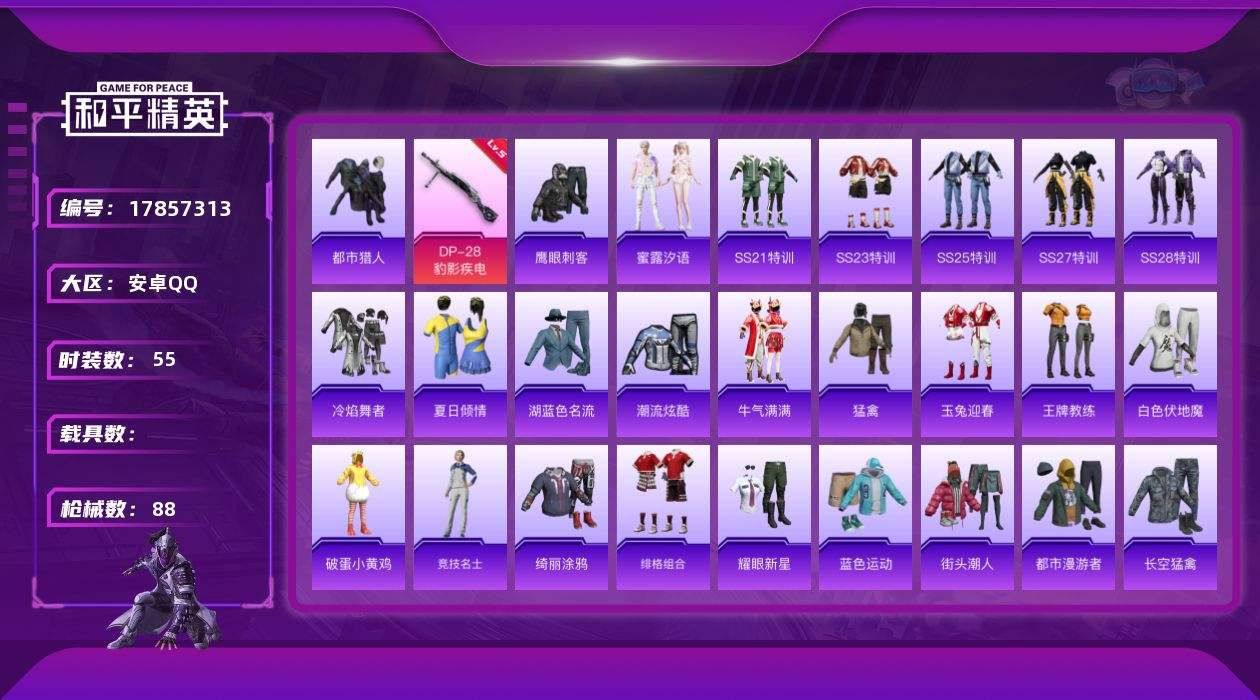 【585754】[17857313]【FK6378】55套装/枪械4/装备65/战备57/王牌印记2/热力值21200/四级UMP45-萌骑冒险/五级AKS-74U-森灵之息/五级Mk14-福马献瑞/五级DP-28-豹影疾电/都市猎人/UMP45-萌骑冒险/AKS-74U-森灵之息/Mk14-福马献瑞/DP-28-豹影疾电/炫彩糖果飞行器/炫光之旅降落伞/炫彩糖果降落伞/套装-雪国风尚/炫彩糖果