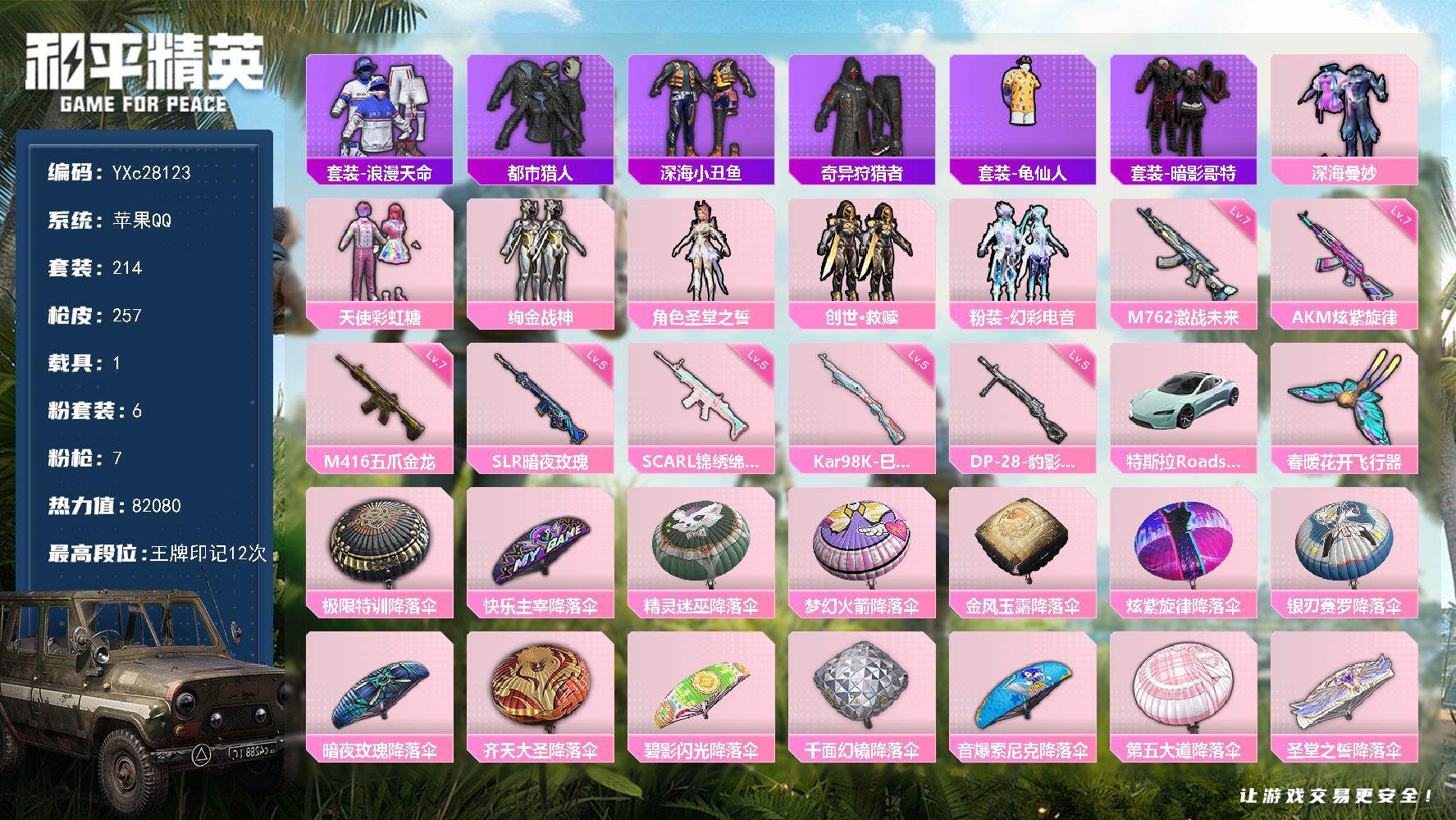 【586964】【可二次】【苹果QQ】快乐主宰降落伞 龟仙人 齐天大圣降落伞 梦幻火箭降落伞 水银刺客 极限特训降落伞 S686-奇异狩猎者 M416-五爪金龙 漫步者 都市猎人 千面幻镜降落伞 M24-奇异狩猎者 精灵迷巫降落伞 极速红龙 炫紫旋律降落伞 碧影闪光降落伞 第五大道降落伞 街舞达人 浪漫假日 深海小丑鱼 瑞龙福将 特斯拉R水滴蓝 浪漫天命 摇滚狂鲨 银刃赛罗降落伞 团圆交子 缤纷