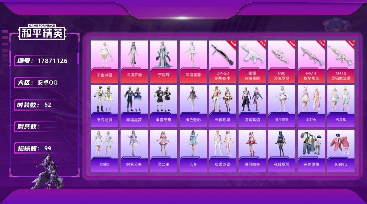 【587456】[17871126]安卓 手Q-6粉装-8特效枪-0载具-3粉色飞行器-29483热力值-2王牌印记-52套装-99枪皮【粉色套装】:角色-千金淑猫,角色-冷漠罗丽,角色-宁雨蝶,角色-荧海星豚,角色-罪夜之冕,角色-千仞雪【粉色枪皮等级】:M416-灵猫魔法师(三级),AUG-罪夜之冕(五级),蜜獾-荧海星豚(五级),P90-冷漠罗丽(五级),Mk14-甜梦熊击(五级),Mk1