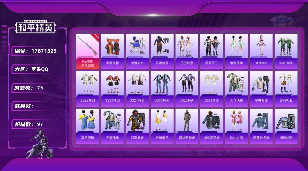 【587468】[17871325]苹果 手Q-0粉装-5特效枪-0载具-0粉色飞行器-25587热力值-8王牌印记-75套装-97枪皮【热门品类】:套装-浪漫天命,套装-忍者信条【粉色枪皮等级】:ACE32-萌骑漫游(五级),UMP45-萌骑冒险(五级),AKS-74U-森灵之息(五级),Kar98K-巳巳如意(五级),Mk14-福马献瑞(五级)【粉色枪皮】:ACE32-萌骑漫游,UMP45-