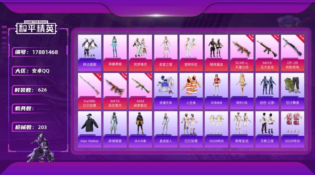 【589107】【可二次】【安卓QQ】软萌银虎 龟仙人 AKM-绿萝繁花 M416-五爪金龙 漫步者 M24-奇异狩猎者 M762-瑞龙福将 潮萌小黄鸭 狂沙舞者 忍者信条 诡面顽熊 M416-风花雪月 SCAR-L-天蓬元帅 AKM-百万伏特 粉红小猪 瑞龙福将 激萌小黄鸭 神秘黑猫 浪漫天命 胖达圆圆 团圆交子