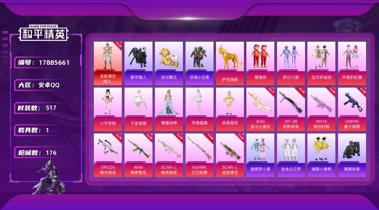 【589619】【可二次】【安卓QQ】龟仙人 AKM-绿萝繁花 漫步者 都市猎人 潮萌小黄鸭 韶华初心 金蛇镇世-烛九 梦起落英 M762-奇异狩猎者 M416-电玩时刻 SCAR-L-锦绣绵绵 UMP45-量子极限 梦幻火箭 天使彩虹糖 深海小丑鱼 宝贝奶油派 激萌小黄鸭 派对舞王 浪漫天命 猪猪侠 镜光幻境飞行翼 激萌罗小黑