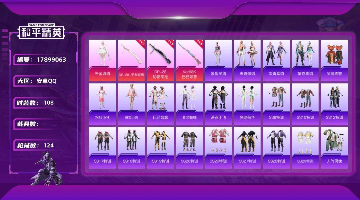 【591581】[17899063]可二次【特价出售/店主推荐】安卓 手Q-1神装-1粉装-4特效枪-40530热力值-3王牌印记-108套装-124枪皮【红色神装等级】:灵驹仙姬-云歌(一级)【热门品类】:套装-粉红小猪【粉色套装】:角色-千金淑猫【粉色枪皮等级】:UMP45-萌骑冒险(五级),Kar98K-巳巳如意(五级),DP-28-千金淑猫(七级),DP-28-豹影疾电(五级)