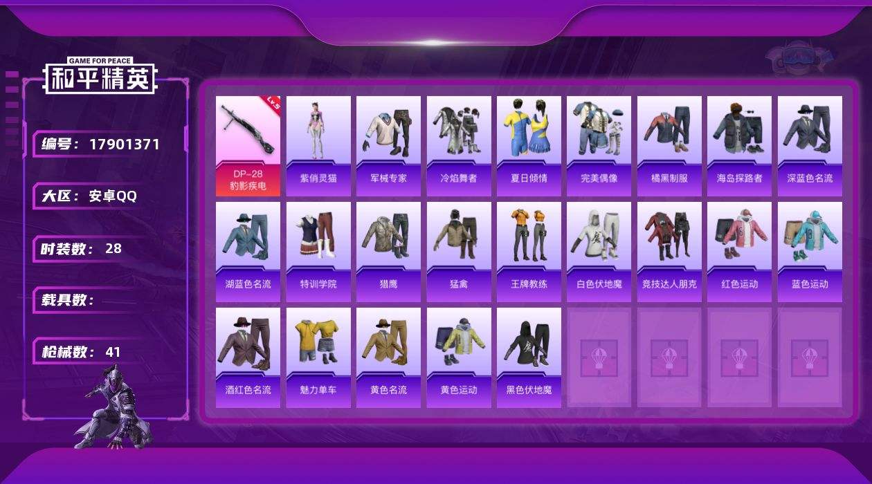【591766】[17901371]【FK6653】28套装/枪械1/装备41/战备35/热力值8626/五级DP-28-豹影疾电/DP-28-豹影疾电/炫彩糖果飞行器/极意拳锋飞行器/星之彼岸降落伞/异瞳寒姬降落伞/炫彩糖果降落伞/炫彩糖果/紫俏灵猫/AUG-冰晶雪宝/AKM-龙的传人/SCAR-L-夜灯/SCAR-L-玉兔迎春/AUG-耀粉歌者/UZI-影袭/UMP45-夜灯/UMP45-生