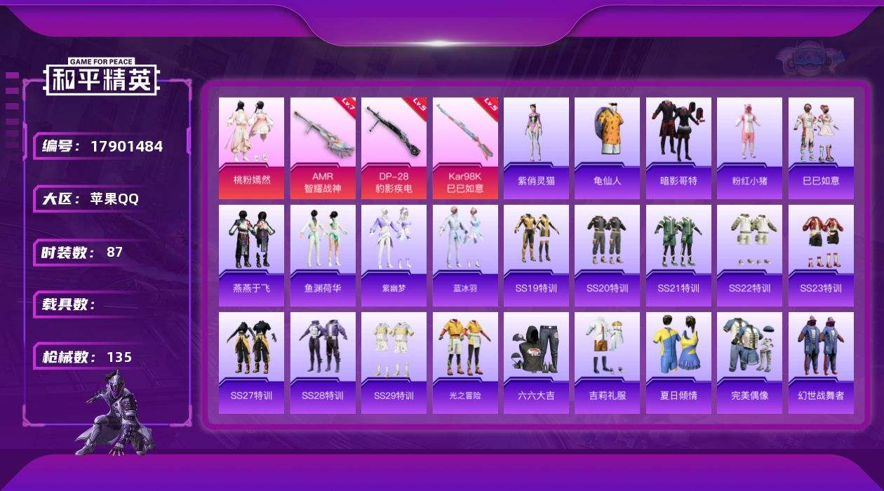 【591780】[17901484]【FK6654】87套装/枪械5/装备125/战备73/王牌印记6/热力值34176/三级UMP45-萌骑冒险/五级Kar98K-巳巳如意/五级Mk14-福马献瑞/七级AMR-智耀战神/五级DP-28-豹影疾电/龟仙人/暗影哥特/粉红小猪/桃粉嫣然/UMP45-萌骑冒险/Kar98K-巳巳如意/Mk14-福马献瑞/AMR-智耀战神/DP-28-豹影疾电/仲夏莫