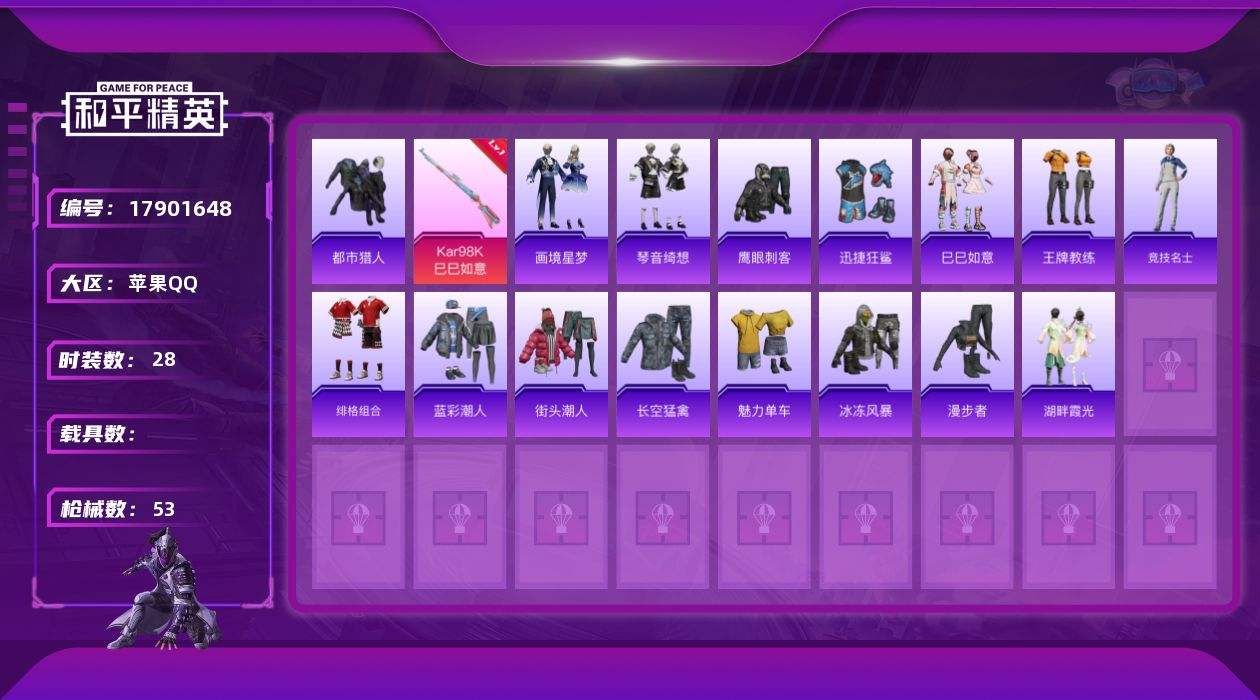 【591800】[17901648]【FK6655】28套装/枪械3/装备63/战备30/王牌印记2/热力值12844/三级UMP45-萌骑冒险/一级Kar98K-巳巳如意/五级Mk14-福马献瑞/都市猎人/UMP45-萌骑冒险/Kar98K-巳巳如意/Mk14-福马献瑞/幻影战神降落伞/精灵梦叶罗丽降落伞/巳巳如意/套装-雪国风尚/套装-马上来财/套装-迅捷龙虾/画境星梦/琴音绮想/套装-雨过