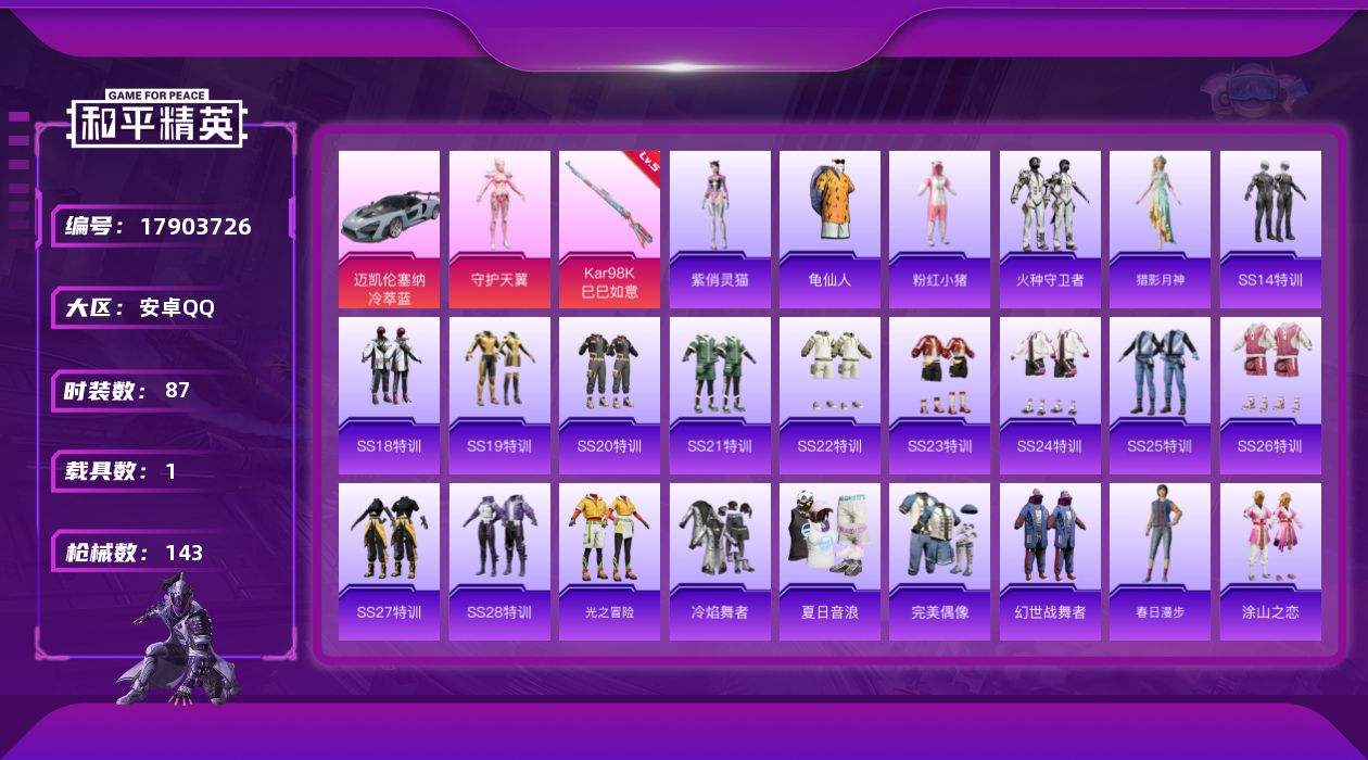 【592110】[17903726]可二次【特价出售/店主推荐】安卓 手Q-1粉装-3特效枪-1载具-1粉色飞行器-39268热力值-8王牌印记-87套装-143枪皮【热门品类】:套装-龟仙人,套装-粉红小猪【粉色套装】:角色-守护天翼【粉色枪皮等级】:UMP45-萌骑冒险(五级),Kar98K-巳巳如意(五级),Mk14-福马献瑞(五级)【粉色载具】:迈凯伦塞纳(冷萃蓝)【粉色枪皮】:UMP4