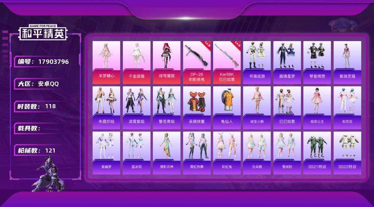 【592120】[17903796]安卓 手Q-3粉装-4特效枪-0载具-1粉色飞行器-38475热力值-10王牌印记-118套装-121枪皮【热门品类】:套装-龟仙人【粉色套装】:角色-千金淑猫,角色-绯穹魔姬,角色-羊梦糖心【粉色枪皮等级】:UMP45-萌骑冒险(五级),Kar98K-巳巳如意(五级),Mk14-福马献瑞(五级),DP-28-豹影疾电(五级)【粉色枪皮】:UMP45-萌骑冒险