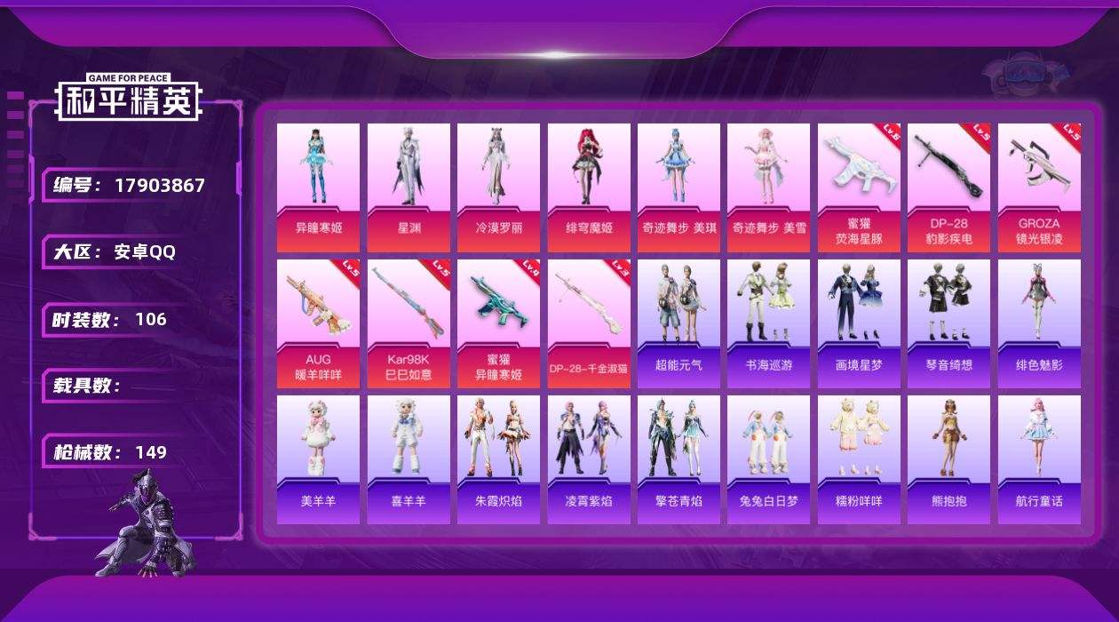 【592131】[17903867]【特价出售/店主推荐】安卓 手Q-7粉装-9特效枪-0载具-2粉色飞行器-46070热力值-7王牌印记-106套装-149枪皮【热门品类】:套装-糯粉咩咩【粉色套装】:角色-冷漠罗丽,角色-绯穹魔姬,角色-奇迹舞步 美琪,角色-奇迹舞步 美雪,角色-星渊,角色-异瞳寒姬,角色-霁蓝缠春【粉色枪皮等级】:GROZA-镜光银凌(五级),AUG-暖羊咩咩(五级),蜜