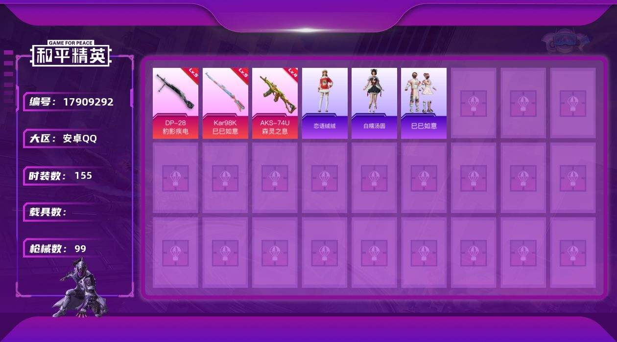 【593075】[17909292]【特价出售】安卓Q-1粉装6特效枪1热门41套装99枪皮 21930热力值 5印记 历史传奇王牌12星 【1粉装】 虹云熊熊 【6特效枪】 AKS-74U-森灵之息 (4级) Kar98K-巳巳如意 (5级) DP-28-豹影疾电 (5级) AKS-74U-森灵之息 (4级) Mk14-福马献瑞 (5级) ACE32-萌骑漫游 (4级) 【1热门】 破蛋小黄鸡