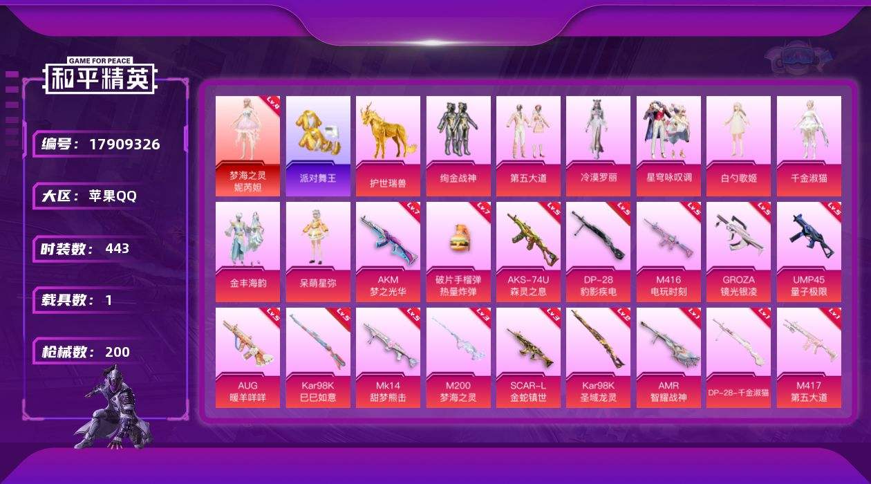 【593088】【不可二次】【苹果QQ】龟仙人 红熊茄茄 绚金战神 梦海之灵-妮芮妲 M417射手步枪 狂沙舞者 M416-电玩时刻 UMP45-量子极限 AKM-梦之光华 幻海精灵飞行器 粉红小猪 M200-梦海之灵 派对舞王 软软马卡龙 M417-第五大道 浪漫天命