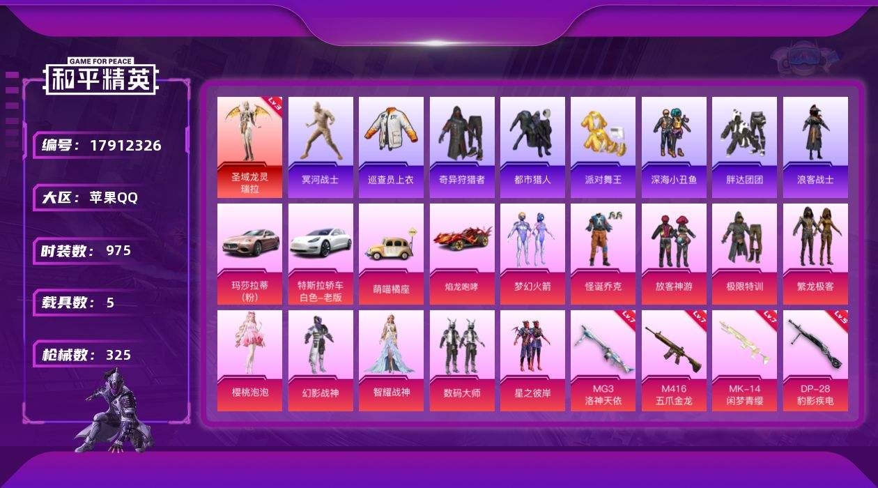 【593674】【不可二次】【苹果QQ】龟仙人 水银刺客 焰龙咆哮 大橘为重 漫步者 都市猎人 MK14-闲梦青缨 M762-奇异狩猎者 深海小丑鱼 AWM-激战未来 Kar98K-伏魔团 AKM-奇异狩猎者 特斯拉3白色 怪诞乔克 迅捷狂鲨 M762-瑞龙福将 狂沙舞者 白月香洋装 神秘黑猫 木乃伊 S686-奇异狩猎者 M416-五爪金龙 M24-奇异狩猎者 特斯拉3银色 东方飞龙 机械英豪