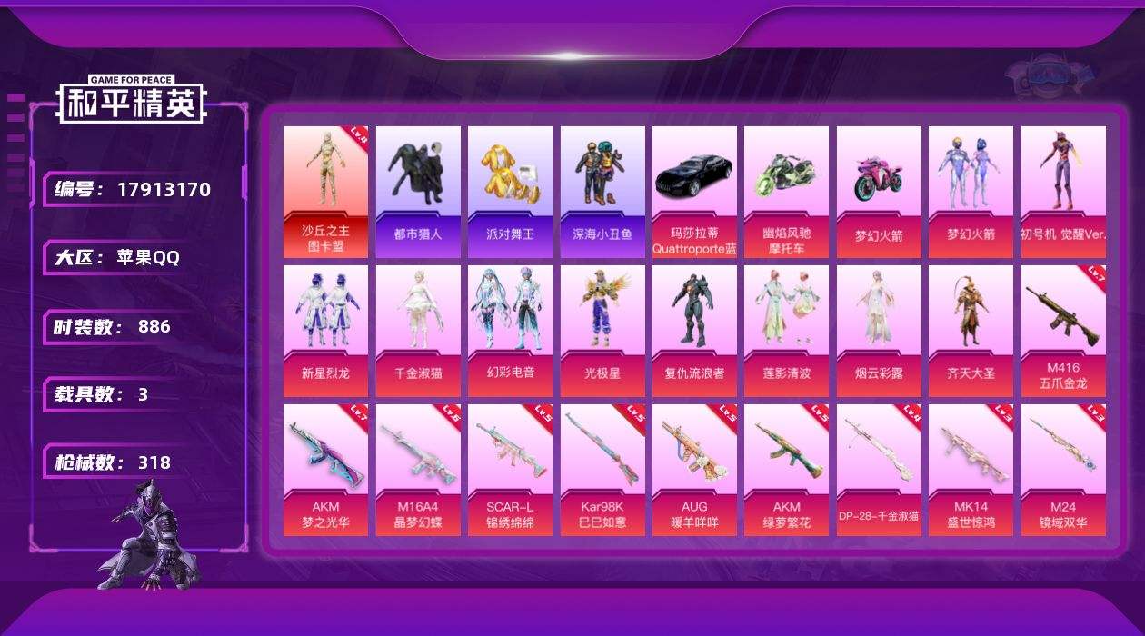 【593811】【可二次】【苹果QQ】龟仙人 AKM-绿萝繁花 双人摩托梦幻火箭 M416-五爪金龙 漫步者 都市猎人 新星烈龙 沙丘之主-图卡盟 深海小丑鱼 瑞龙福将 醒狮腾龙 浪漫天命 梦幻火箭飞行器 梦之呓语 团圆交子 M24-镜域双华 迅捷狂鲨 M762-瑞龙福将 齐天大圣飞行器 龙翔九天飞行器 金羽特工 齐天大圣 SCAR-L-锦绣绵绵 梦幻火箭 AKM-梦之光华 AKM-百万伏特 派