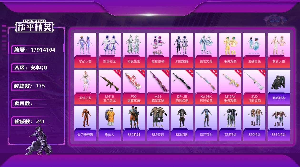 【593918】【可二次】【安卓QQ】蓝莓炮弹 梦幻火箭 M416-五爪金龙 新星烈龙 M24-暗星紫秘 幻情紫藤 相思残雪