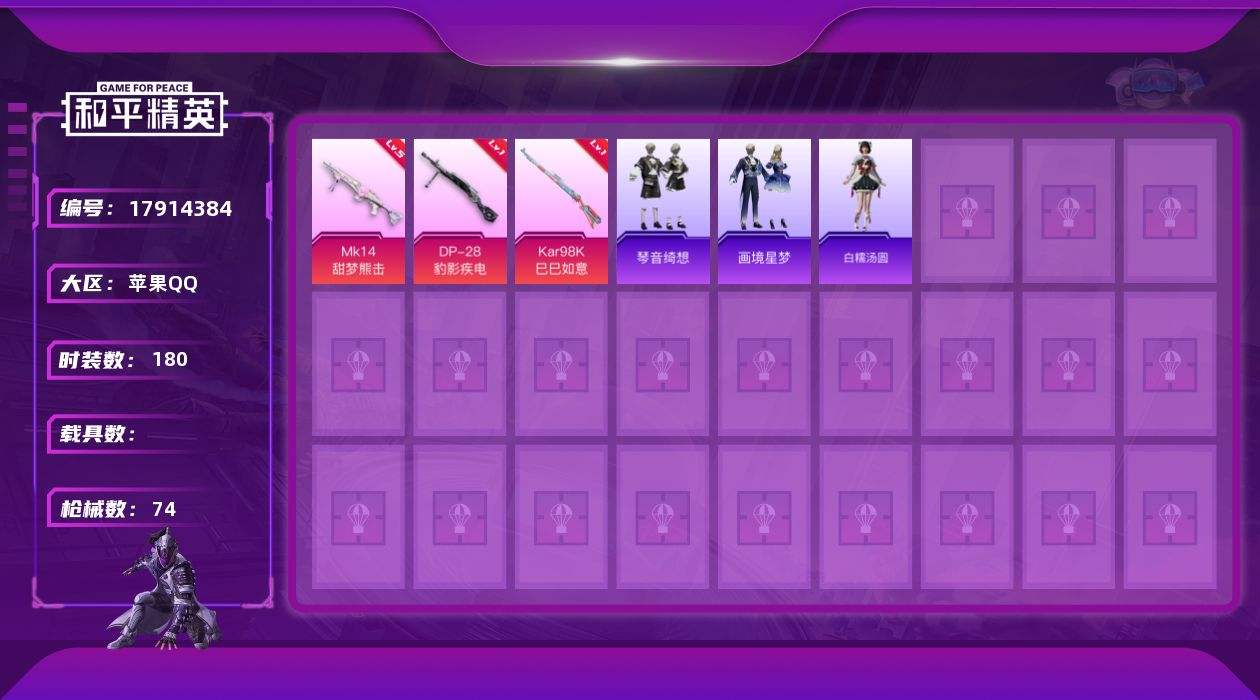 【593940】[17914384]【特价出售】苹果Q-4特效枪1热门39套装74枪皮 17059热力值 1印记 历史超级王牌4星 【4特效枪】 Kar98K-巳巳如意 (1级) DP-28-豹影疾电 (1级) Mk14-甜梦熊击 (5级) ACE32-萌骑漫游 (3级) 【1热门】 破蛋小黄鸡