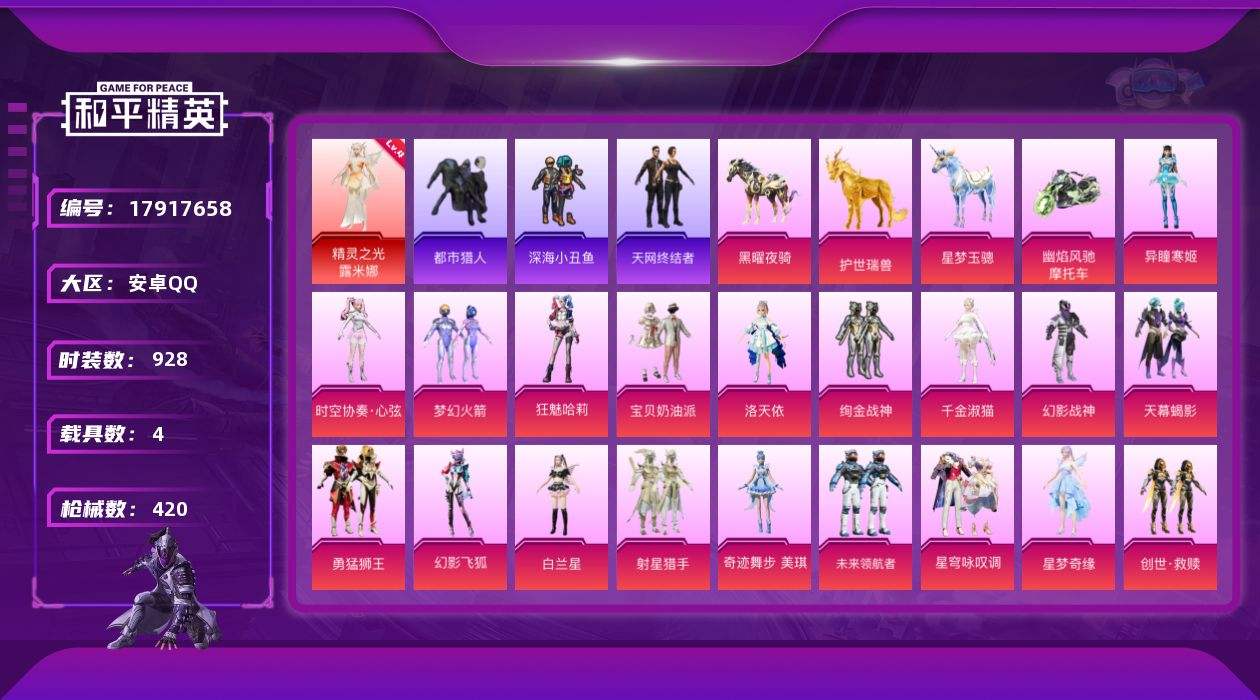 【594320】【可二次】【安卓QQ】龟仙人 AKM-绿萝繁花 水银刺客 大橘为重 M762-青锋波束 漫步者 都市猎人 韶华初心 洛天依 西部牛仔 Kar98k-未来歌姬 精灵之光-露米娜 M762-奇异狩猎者 M416-电玩时刻 AUG-星梦奇缘 UMP45-量子极限 星之彼岸 M416-心之恋语 浪漫假日 深海小丑鱼 AUG-星之彼岸 浪漫天命 破片手榴弹-粉粉猫爪 星梦玉骢 绚金战神 迅