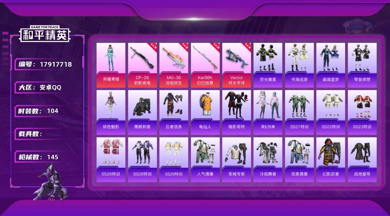 【594330】[17917718]安卓 手Q-1粉装-8特效枪-0载具-1粉色飞行器-34409热力值-5王牌印记-104套装-145枪皮【热门品类】:套装-忍者信条,套装-龟仙人,套装-暗影哥特【粉色套装】:角色-异瞳寒姬【粉色枪皮等级】:ACE32-萌骑漫游(二级),UMP45-萌骑冒险(二级),Vector-环太平洋(四级),AKS-74U-森灵之息(五级),Kar98K-巳巳如意(五级