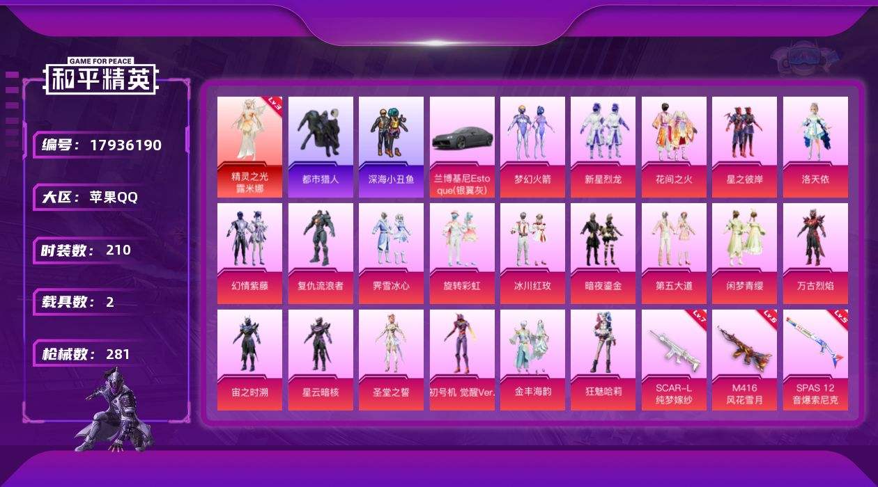 【597146】【不可二次】【苹果QQ】M416-风花雪月 梦幻火箭 都市猎人 新星烈龙 深海小丑鱼 MG3-洛神天依 洛天依 兰博轿车灰色 SCAR-L-青春物语 幻情紫藤 蓝螳螂