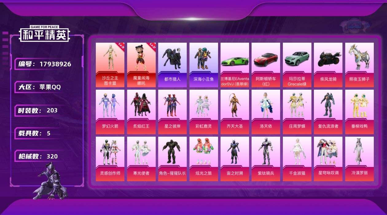 【597455】【可二次】【苹果QQ】齐天大圣 兰博SVJ绿色 庄周梦蝶 梦幻火箭 M416-五爪金龙 AKM-梦之光华 阿斯顿马丁S红色 都市猎人 深海小丑鱼 洛天依 彩虹鹿灵 蓝螳螂