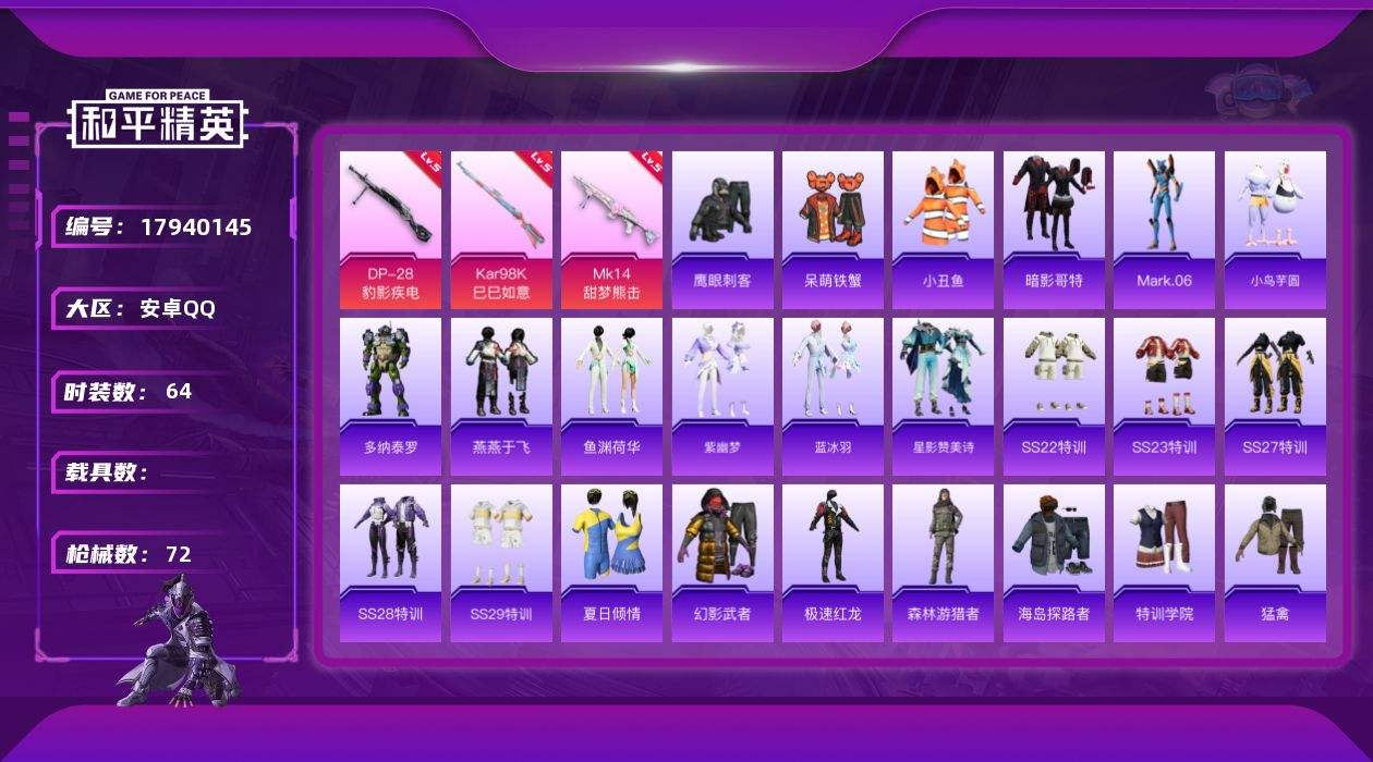 【597589】[17940145]安卓 手Q-0粉装-5特效枪-0载具-0粉色飞行器-20546热力值-3王牌印记-64套装-72枪皮【热门品类】:套装-小丑鱼,套装-暗影哥特,角色-Mark.06【粉色枪皮等级】:Kar98K-巳巳如意(五级),Mk14-甜梦熊击(五级),Mk14-福马献瑞(一级),AA12-G-萌骑幻想(二级),DP-28-豹影疾电(五级)【粉色枪皮】:Kar98K-巳巳