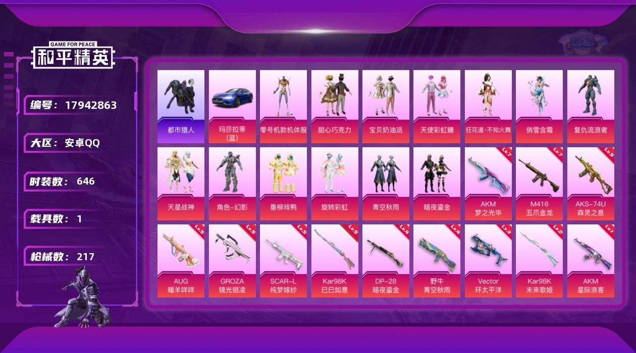 【597995】【可二次】【安卓QQ】龟仙人 俏雪含霜 AKM-星际浪客 M416-五爪金龙 漫步者 都市猎人 豚鼠丹丹 Kar98k-未来歌姬 M762-奇异狩猎者 DP-28-暗夜鎏金 野牛-青空秋雨 黄螳螂 M24-香水柠檬 浪漫天命 AKM-奇异狩猎者 Vector-环太平洋 甜心巧克力 玛莎拉蒂蓝色 AKM-梦之光华 天使彩虹糖 粉红小猪 SCAR-L-纯梦嫁纱 宝贝奶油派 暗影哥特