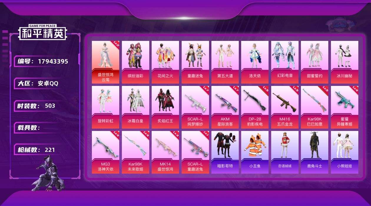 【598157】【不可二次】【安卓QQ】龟仙人 AKM-星际浪客 M416-五爪金龙 花间之火 迅捷狂鲨 暗夜契约 炙焰红王 MG3-洛神天依 洛天依 梦幻舞会飞行器 Kar98k-未来歌姬 盛世惊鸿-云鸾 缤纷油彩 粉红小猪 SCAR-L-纯梦嫁纱 SCAR-童趣迷兔 童趣迷兔 甜蜜誓约 暗影哥特 冰霜白皇