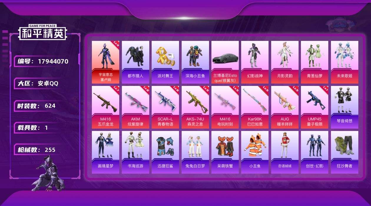 【598305】【不可二次】【安卓QQ】龟仙人 M416-五爪金龙 繁龙极客飞行器 都市猎人 迅捷狂鲨 青葱仙萝 兰博轿车灰色 狂沙舞者 宇宙意志-塞卢姆 忍者信条 M416-电玩时刻 AKM-炫紫旋律 UMP45-量子极限 AKM-缤纷海域 深海小丑鱼 幻影战神 派对舞王 SCAR-L-青春物语