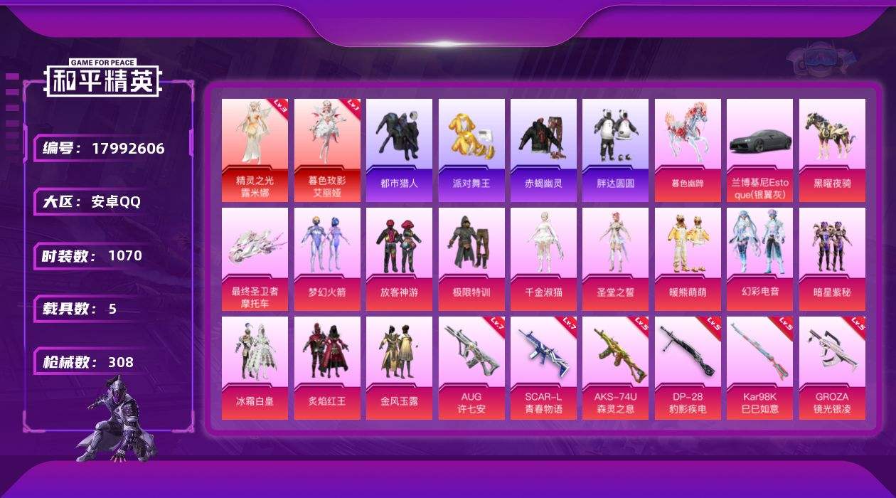 【605064】【不可二次】【安卓QQ】龟仙人 水银刺客 暗星紫秘 大橘为重 漫步者 都市猎人 炙焰红王 极限特训 极速红龙 忍者信条 赤蝎幽灵 精灵之光-露米娜 M762-奇异狩猎者 放客神游 M416-心之恋语 萌熊伴侣 瑞龙福将 抹茶蜜豆 浪漫天命 梦幻火箭飞行器 激萌罗小黑 胖达圆圆 团圆交子 迅捷狂鲨 暗夜契约 M762-瑞龙福将 黑色刀锋 兰博轿车灰色 狂沙舞者 金风玉露 暗夜之虎
